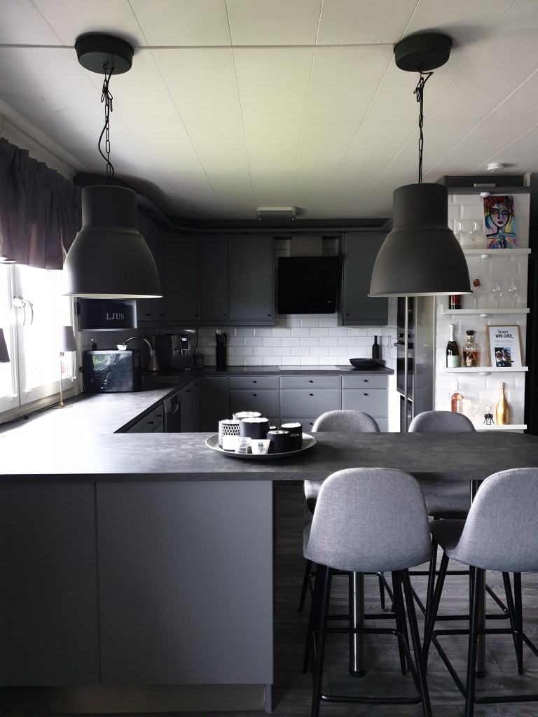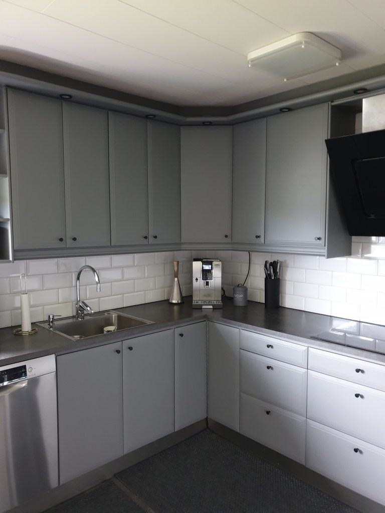 När vi köpte vårt hus för 11 år sedan så älskade jag planeringen av köket, men avskydde att det var i ek. Tiden gick och vi levde med köket så i 7 år. För fyra år sedan bytte vi bänkskiva, kaklade och lämnade iväg våra luckor på lackering. Då stod vi och velade mellan vitt och grått, men bestämde oss till slut för vitt och vi blev jättenöjda. Så småningom började jag ångra att vi inte hade tagit grått. I torsdags berättade jag för Andrej att jag alltid ångrat att vi inte tog grått och det visade sig att han hade känt likadant hela tiden. Då vi hade 2 olika sorters grå färg hemma så bestämde vi oss för att provmåla med dem på kartong och se hur det skulle sett ut. Dagen efter väckte Andrej mig och frågade vilken färg jag gillade mest och sen sa han okej då kör jag nu och handlar färg så målar vi. Trots att vi skulle ha gäster den dagen så började Andrej direkt, ja min man är så