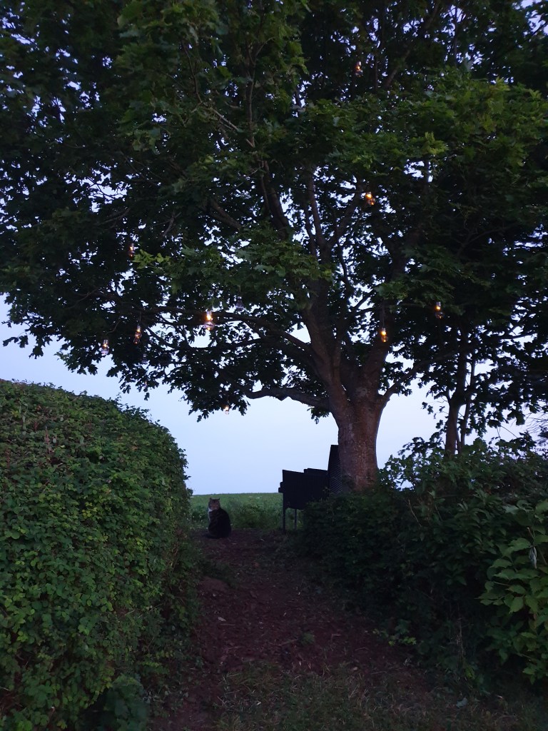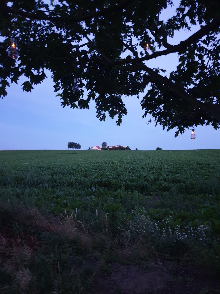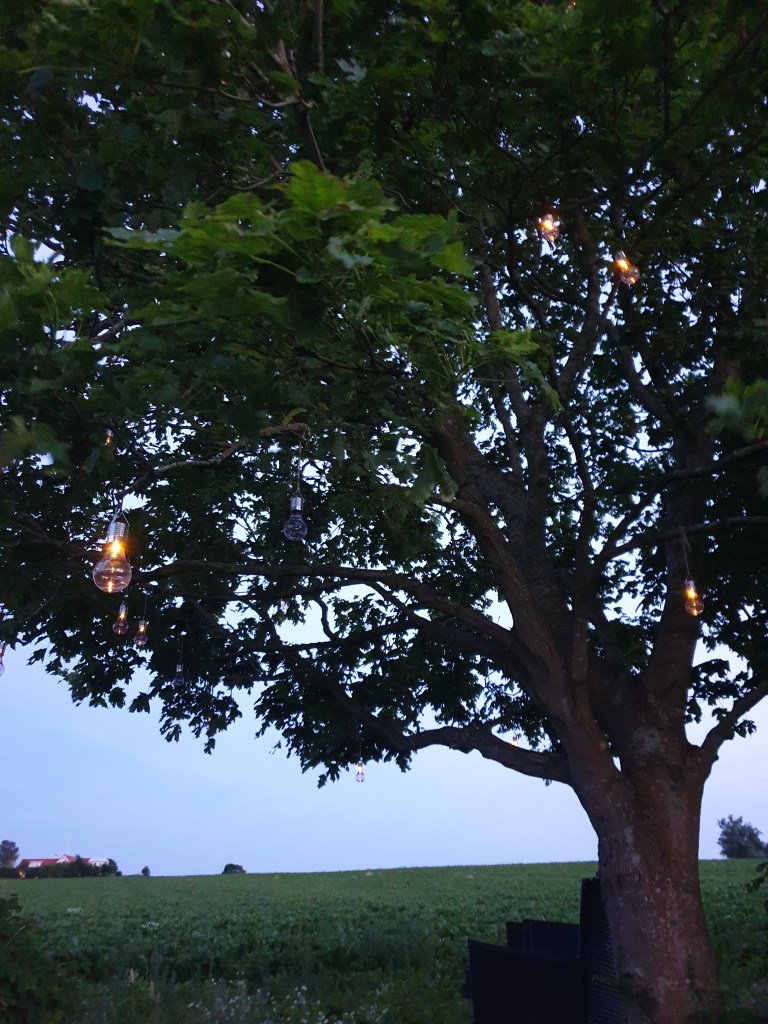 Högst upp i vår trädgård, (ja det är lutning) under vårt stora träd har jag skapat en liten myshörna med hängande solcellslampor och två stolar. Där kan man gå upp och sätta sig en varm sommarkväll med ett glas vin och njuta av utsikten över åkern.
