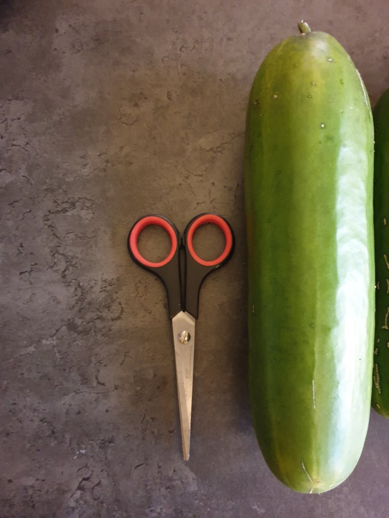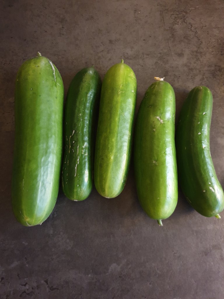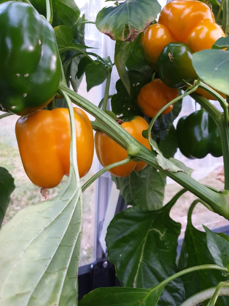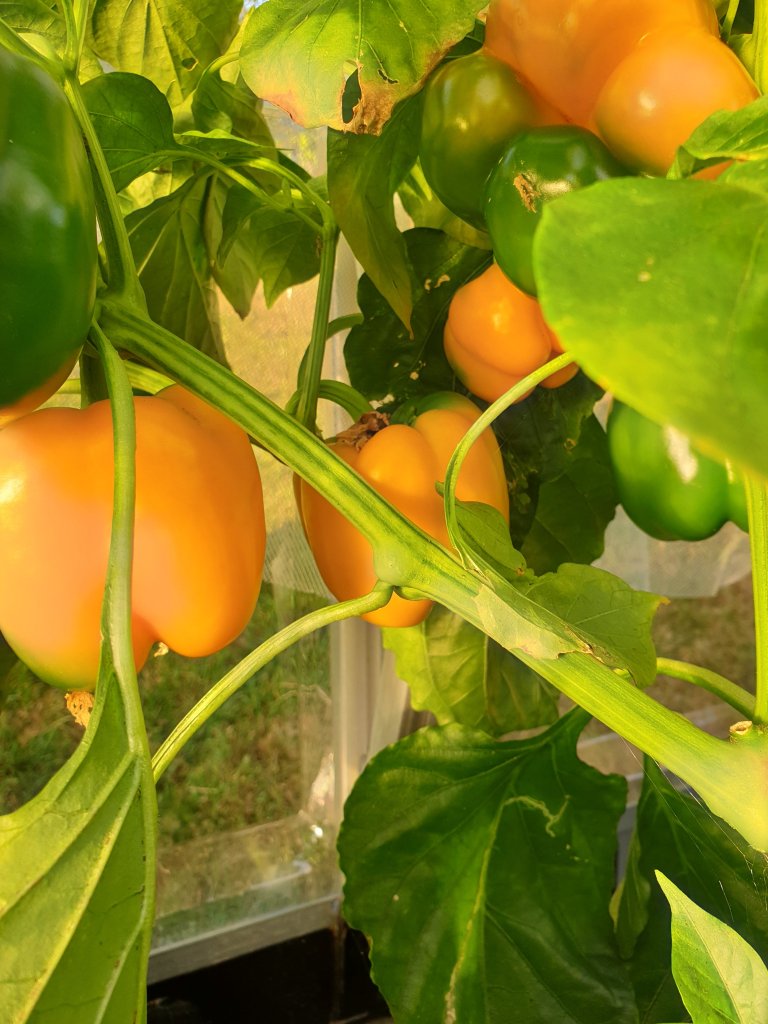 Woke up this morning and ran out to my greenhouse to look at my plants and saw that the peppers are now starting to turn yellow. I only have one plant and 8 peppers grow on it. It will be so exciting to soon get to taste these. When I got home from work tonight, I had to go out to the greenhouse again and look. A lot had happened in just a few hours. The vigor was absolutely incredible! The peppers have become even yellower in this short time. As usual, I watered both this and all the other plants tonight and then found a cucumber that had hidden behind a pot that I completely missed and it was huge!