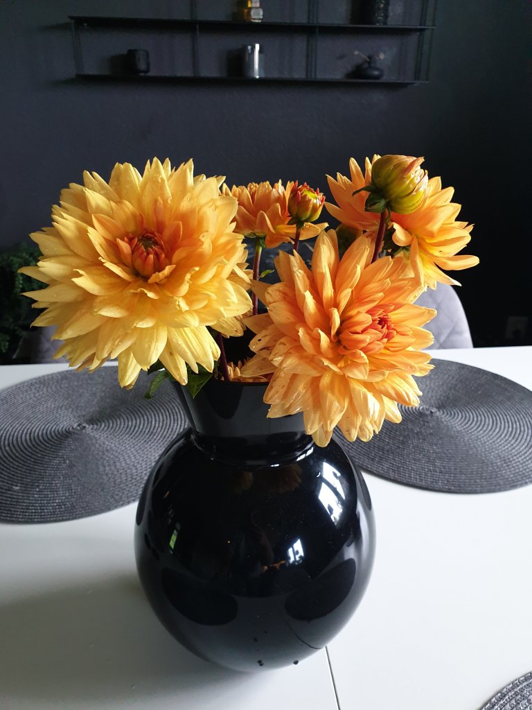 Plockade in en bukett med dahlior från trädgården imorse. De blommar som aldrig förr😍 snart är det dags att gräva upp lökarna så inte frosten tar dem sen får de vila i källaren till våren när de ska ner i jorden igen.