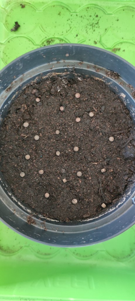 Lägg ca 20 frön på ytan med lite mellanrum så de inte ligger ända intill varandra.