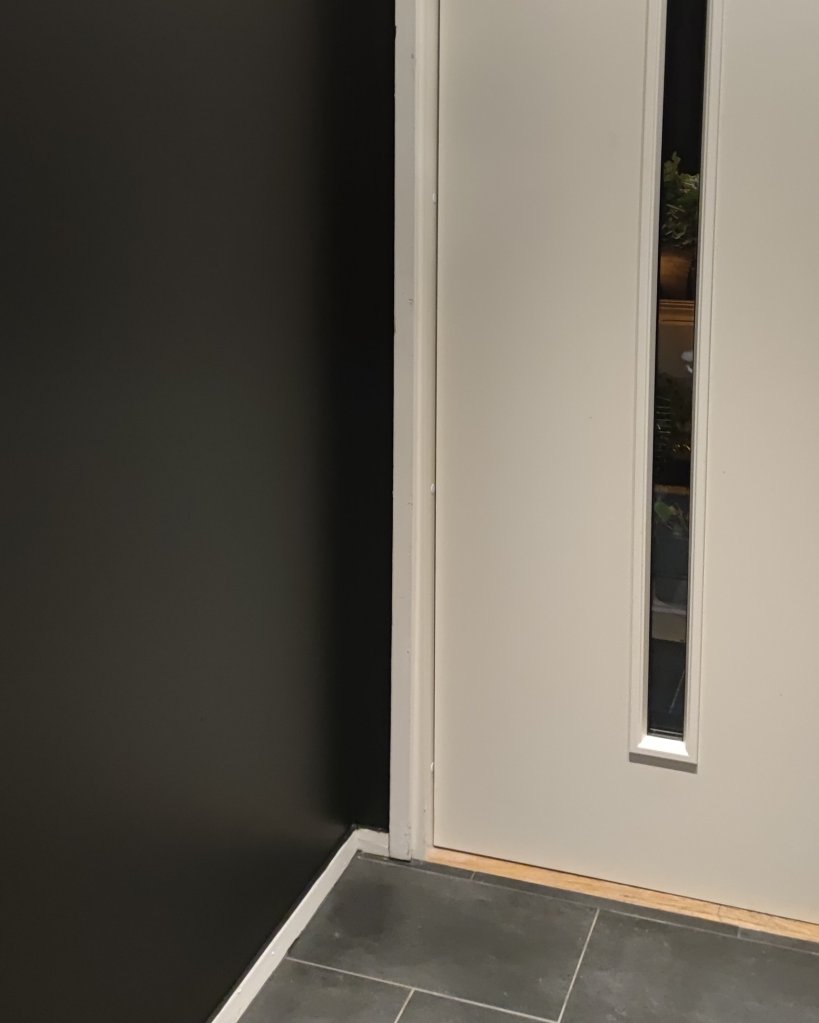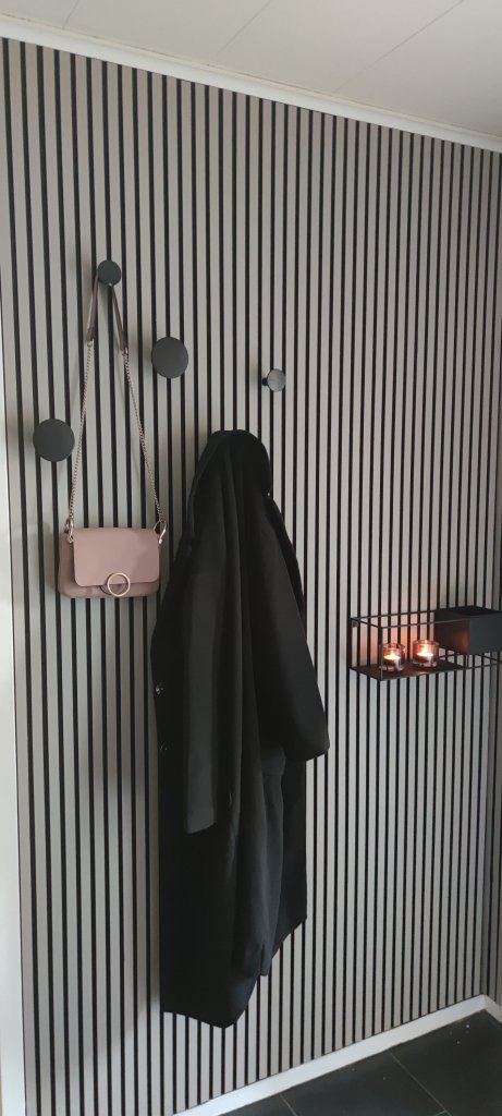 Då Andrej inte gillar trälook och vi kompromissade så bestämde vi oss för att måla ribborna i samma färg som övriga hallen. Färgen vi har där är ”Mio Strå” från Nordsjö. Att måla in dem gör att de inte sticker ut lika mycket utan mer smälter in i hallen.
