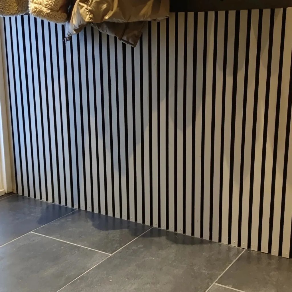 Sen köpte vi hela mdf-skivor och dessa har vår fantastiskt duktiga granne hjälpt oss att såga ut ribbor av. Ribborna målade vi sedan svarta på sidorna för att skapa ytterligare effekt. Då de var lite för långa så kortade jag ner dem med hjälp av en kap och geringssåg. Sen var det bara för Andrej att spika fast dem på väggen.
